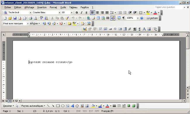Si vous l'ouvrez avec WORD, vous devez retrouver notre ligne de texte test relance client