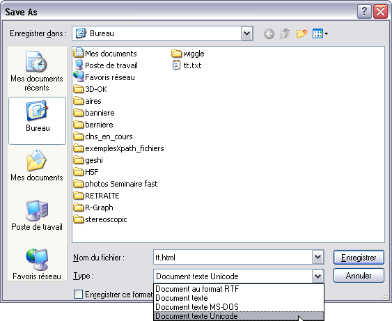 En bas de fenêtre, sélectionner Type et choisir Document texte Unicode.