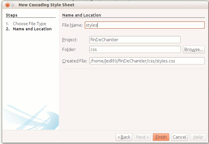 La création d'un fichier n'est pas plus complexe. Pour créer un nouveau fichier, par exemple styles.css dans le dossier css, sélectionner le dossier css dans notre projet finDeChantier, puis cliquer dans la barre de menu sur New et sélectionnez Cascading Style Sheet. Dans la fenêtre indiquez le nom du fichier à créer, ici styles pour créer styles.css: