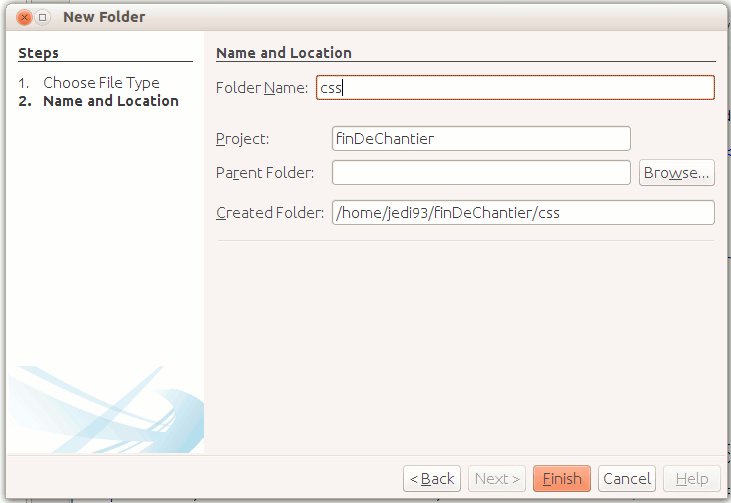 - dans le champ intitulé Projet Name, saisir le nom du projet: finDeChantier. Nous retrouverons ensuite ce nom de projet à chaque ré-ouverture de NetBeans.