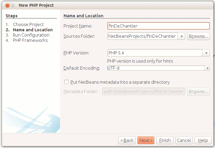 - dans le champ intitulé Put NetBeans metadata into a separate directory vous pouvez laisser cette option en l'état. Si vous la modifiez, indiquez le répertoire dans lequel vous allez stocker ces méta-données. Par exemple, sur un support externe, ces méta-données vous permettront d'utiliser les paramètres de votre projet sur des ordinateurs et/ou des environnement de développement différents. Pour notre exemple, nous allons laisser ce champ inchangé.