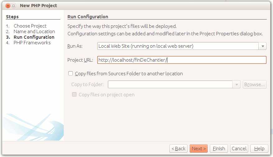 - le champ intitulé Run As indique si l'environnement d'exécution est local. Pour votre projet, vous devez installer WAMP Server (pour Windows) ou LAMP Server (pour Linux). Pour notre exemple, nous laisserons ce champ inchangé.