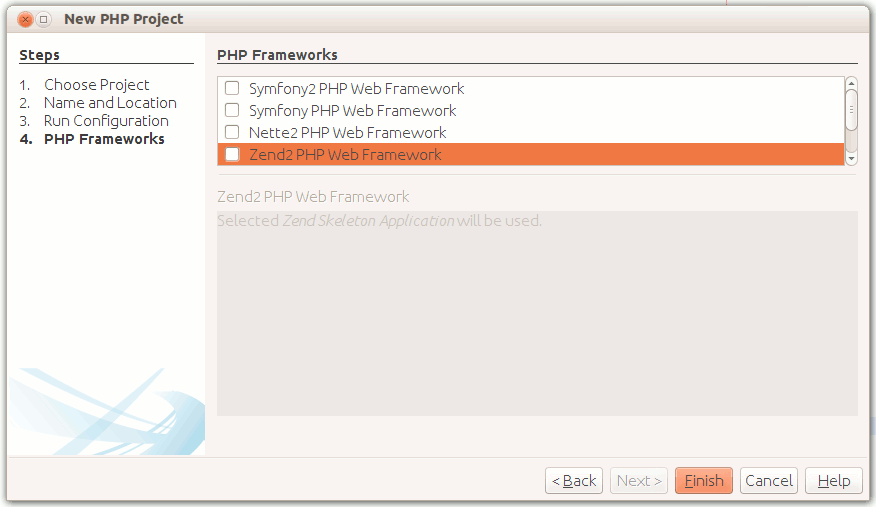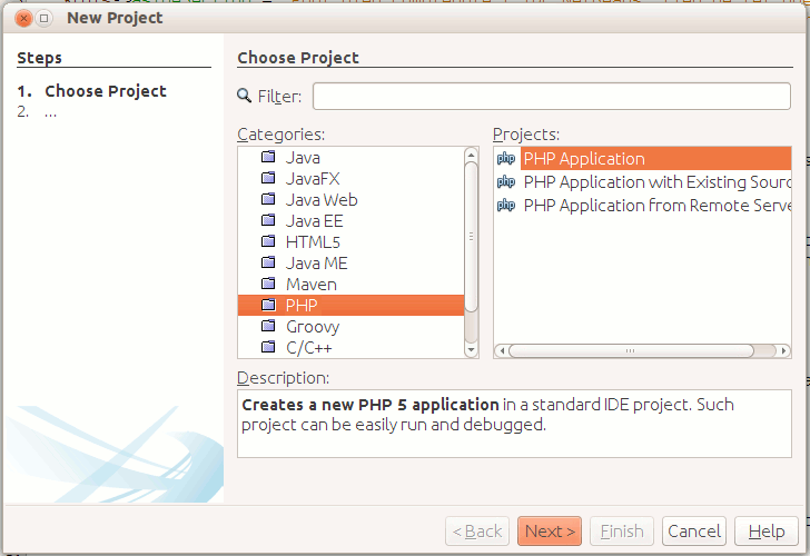 Dans la sous-fenêtre Categories, sélectionner PHP et dans la sous-fenêtre Projects, sélectionnez PHP Application.